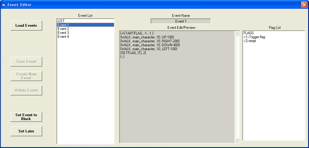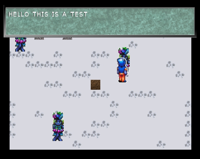 Script: WALK, STARTFLAG, SETFLAG, DIALOG, CHOICE, WARP, MAPWARP, PAUSE, CBLOCK, EBLOCK, MAPSCROLL, TILE and NPC ADD/REMOVE function.